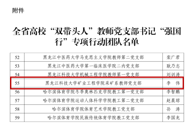 近日,黑龙江省委教育工委公布了全省高校“双带头人”教师党支部书记“强国行”专项行动团队名单,我院采矿工程系教师党支部(负责人:李伟)入选。