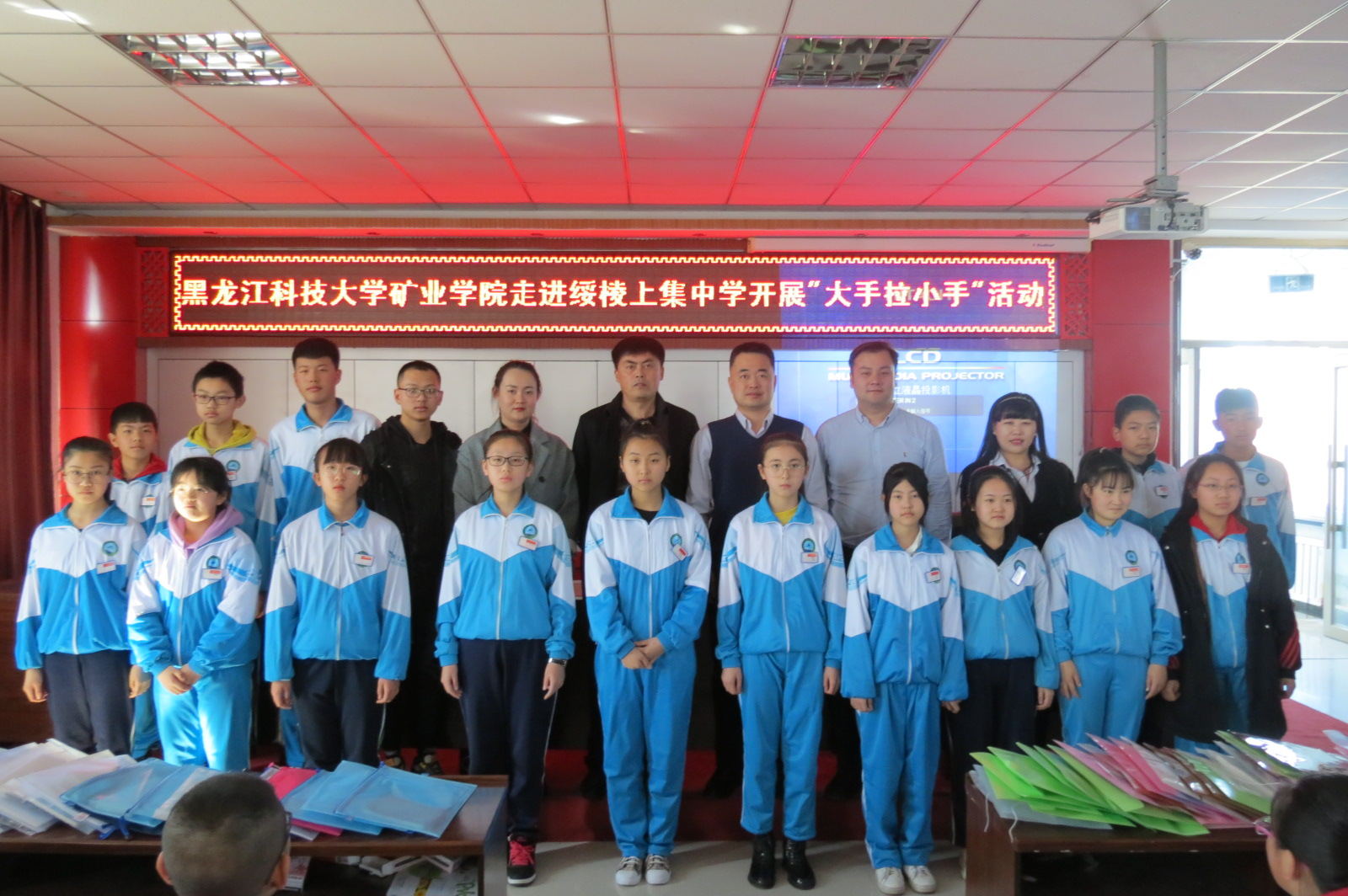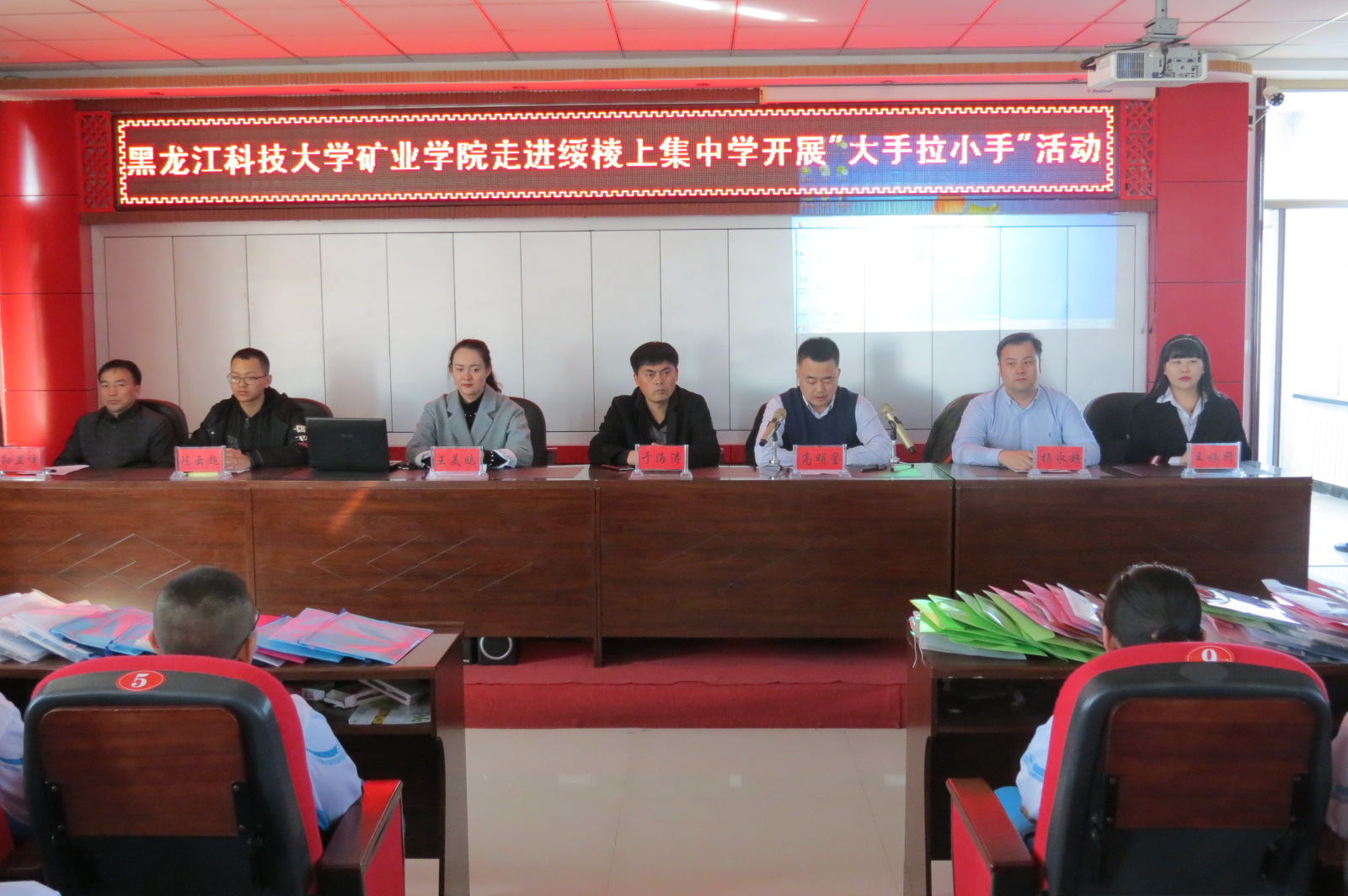 3月27日,矿业工程学院党委副书记高明星、分团委负责人杨永超、辅导员王美鸥及学生代表陈云超一行四人走进绥棱上集中学开展“大手拉小手”活动,绥棱县上集中学校长于海涛、政教处主任孙显峰、团委书记王姝妍,上集中学班主任及留守儿童参加了活动,本次活动由杨永超主持。
