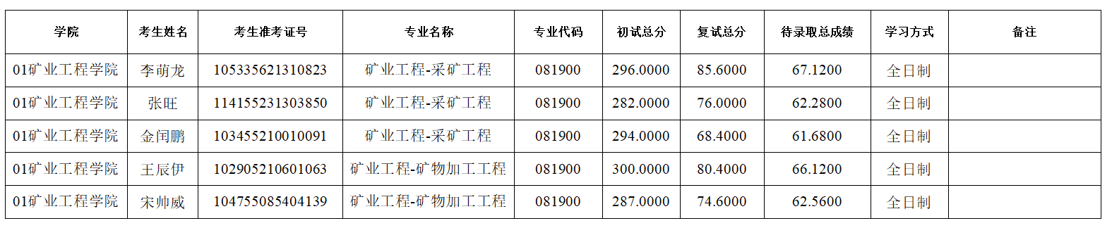 pa集团官网入口2025年硕士研究生招生考试(矿业工程)第二次调剂待录取名单