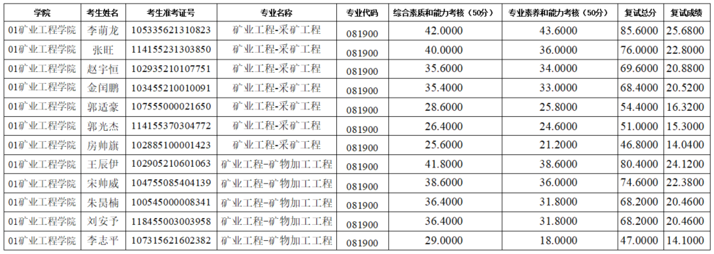 pa集团官网入口2025年硕士研究生招生考试(资源与环境-矿业工程)第二次调剂待录取名单