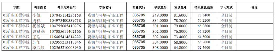 pa集团官网入口2025年硕士研究生招生考试(资源与环境-矿业工程)第二次调剂待录取名单