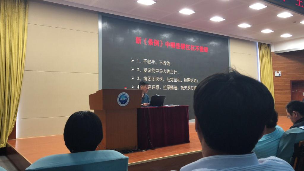 2018年9月26日上午,伟德官网召开全体党员大会,深入学习新修订的《中国共产党纪律处分条例》。党委书记黄先开出席会议并讲话。党委副书记邵长生围绕主题,从条例修订的意义、新条例的特点、主要修订内容、需重点注意的问题等方面进行了详细阐释,要求各党支部要抓好抓实《条例》的学习,严格纪律约束。