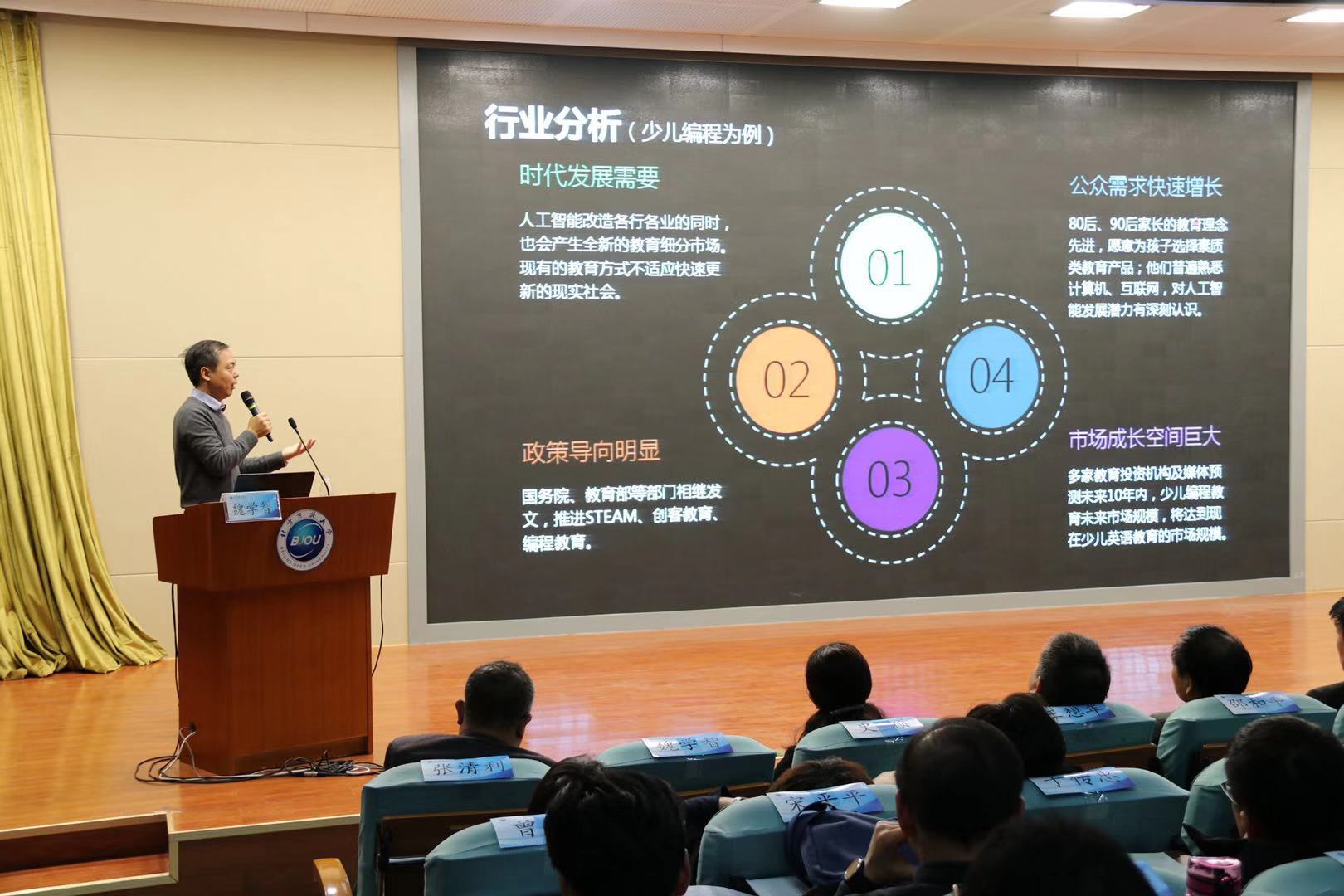 魏学智以《培训项目品牌化培育》为题,向大家介绍了学校培训中心的发展定位,项目策划,市场运营情况,重点介绍了面向青少年STEAM教育的“极客极客”项目,以及面向老年人教育的“九九乐学”项目。他还介绍了中心主动与企业、社区对接,开发职业技能培训项目,开展社会教育服务项目的思路。培训中心依托伟德bv国际体育的优质资源,拥有先进的教育理念和教育方法,完整的课程体系与内容;具备灵活的机制策略,愿意与校内外开展广泛的合作,强强联合,异业合作,携手共创美好未来。