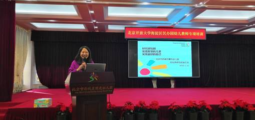 西城曙光幼儿园王晓红园长简要介绍了园所情况以及“生活中学习,游戏中成长”的育人理念。保教主任李楠领衔三位教师做了《研究好玩具,发现智慧的儿童,发现最好的自己》《发展适宜性游戏:引导幼儿向更高水平发展》的游戏研究经验交流和案例分享,贯通了该园“蒙以养正,全面育人;研究兴园,持续发展”的办园思想,四位教师从游戏教学实践出发,立足于游戏支持者(教师)、游戏者(孩子)和游戏载体(玩具),探讨了成就高水平的有质量的游戏的做法。