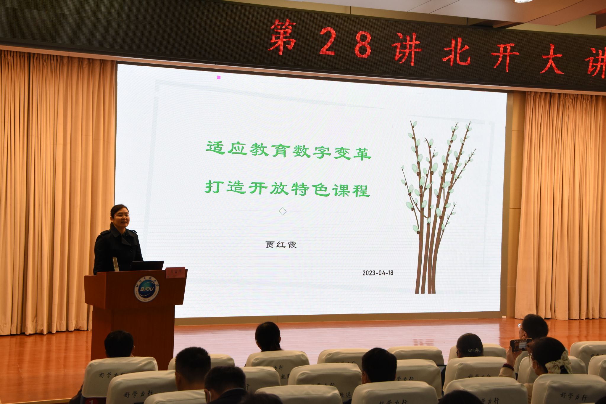 人文与教育学院教授贾红霞做了题为“适应教育数字变革,打造开放特色课程”的专题发言,她基于教育数字化变革背景,立足开放大学的教育定位,分享了开放大学特色课程的建设方向及趋势,并以《儿童发展与幼儿园教育》特色课程为例,介绍了自己建设实践的探索经验。