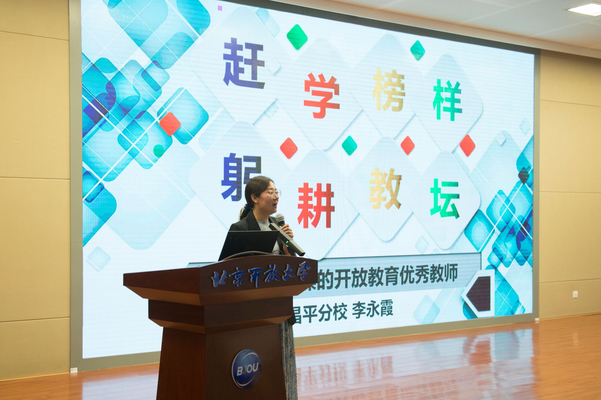 昌平分校教师李永霞以“崇德修身,赶学榜样,做有职业情操的开放教育优秀教师”为题,分享全身心投入教学工作、从学生需求出发为其学习提供支持保障,以及发挥开放教育工作者优势践行社会服务的经验与感悟。