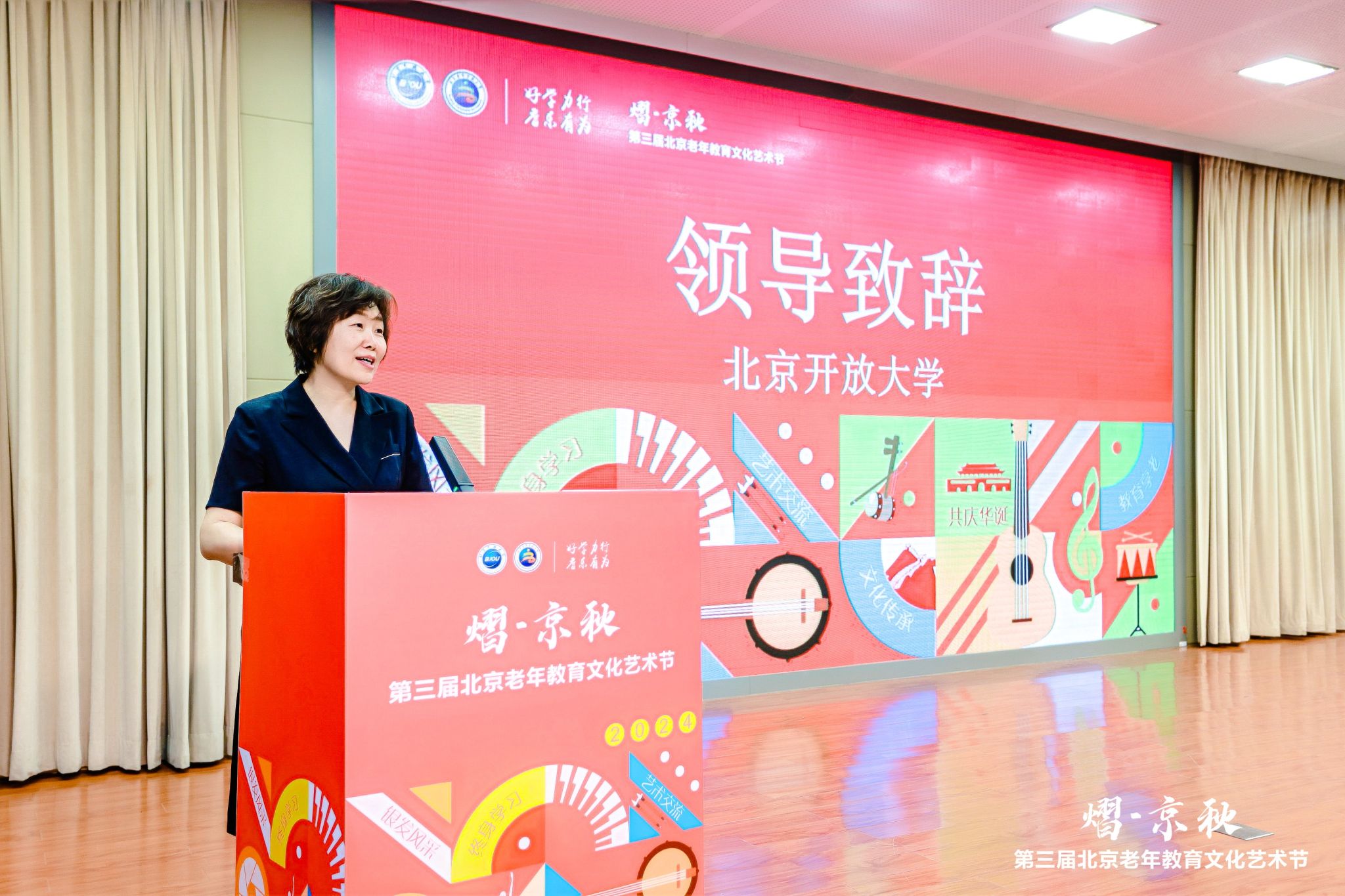 启动仪式在悠扬的民乐团迎宾曲中拉开帷幕。学校党委副书记、校长许晓革在致辞中表示:学校高度重视老年教育工作,建设了遍布全市的老年教育办学体系,线上线下相结合开展老年教育教学工作,围绕住养老人教育、老年人信息科技教育和老年人文化艺术教育分别启动了“学养京城”“智慧助老”以及“老年教育文化艺术节”等品牌项目,促进了全市老年教育的发展,提升了老年人的学习参与率,形成了一定的社会影响力。下一步,学校将结合老年人的需求,不断拓展老年教育服务新路径,以品牌项目带动全市老年教育高质量发展,共同为老龄化社会做出新贡献。