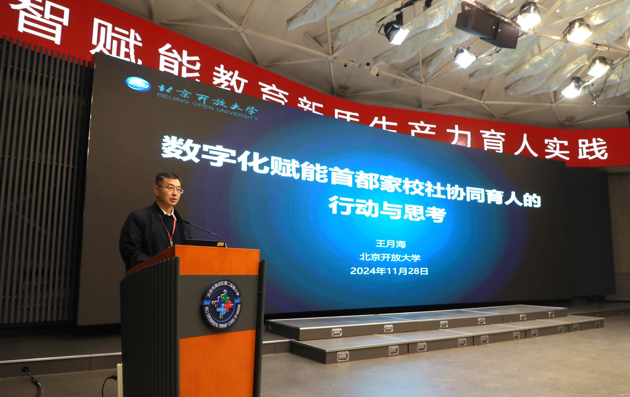 在活动中,伟德bv国际体育副校长王月海发表了主题为 “数字化赋能首都家校社协同育人的行动与思考”的主旨报告。他在报告中深入解读了数字化赋能首都家校社协同育人的行动与思考。详细介绍了北京市在数字化赋能家校社协同育人方面的实践探索,包括全方位数字化宣传、设立网上家长学校、搭建“京学网”及“同育桥”微信小程序等资源共享平台、优化校园数字生态以及AI精准化诊断需求等。