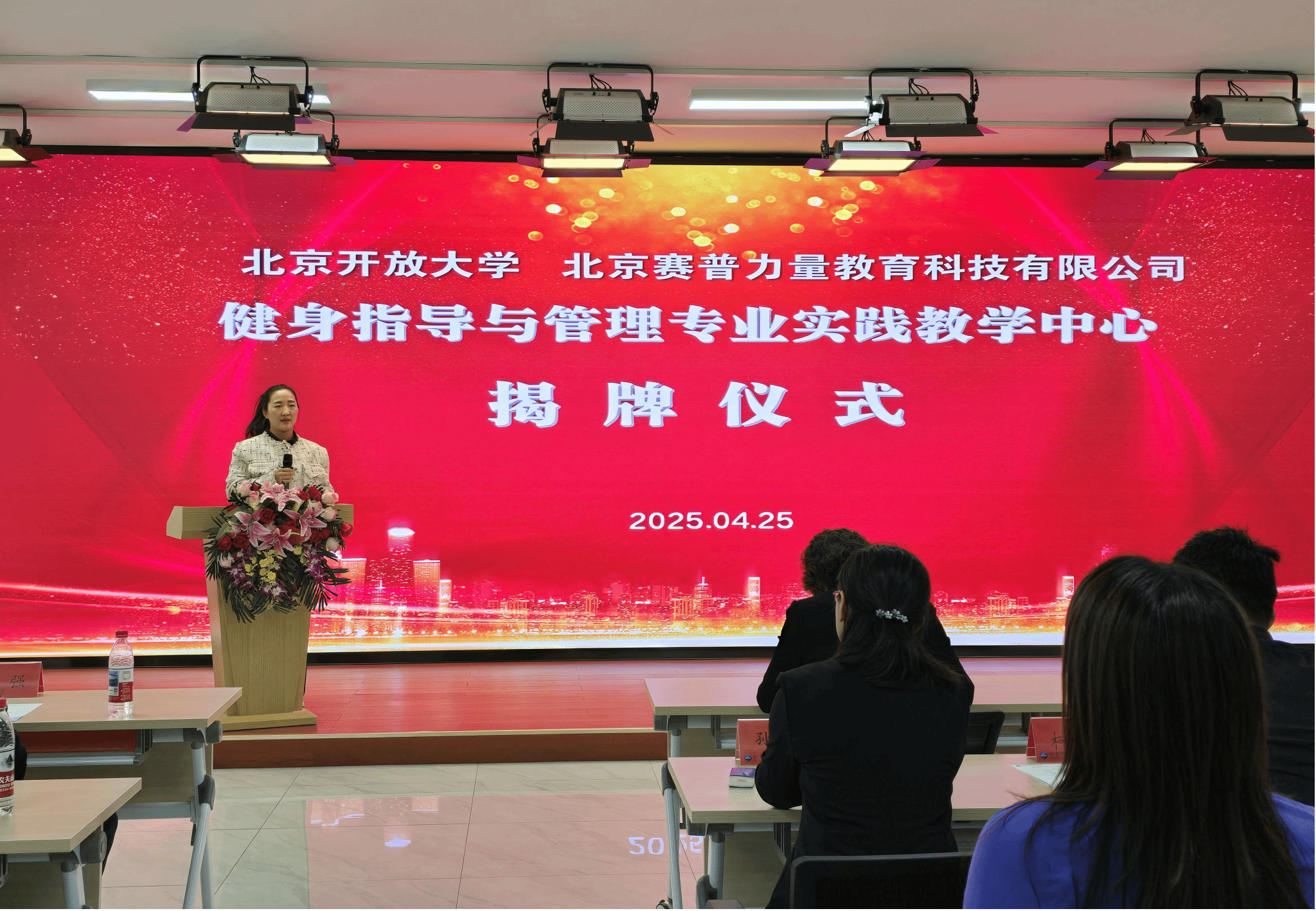 许晓革代表学校向所有来宾表示欢迎,向关心支持实践教学中心建设的北京赛普力量教育科技有限公司表示感谢。她从三个方面阐述了教学中心成立的意义。首先,中心是教育模式上的大胆创新,将前沿健身教育理念与多元化教学方式相结合,不仅为校内师生提供科学的健身指导,更将面向社会开放共享资源,有效提升全民健康素养,这正是学校履行社会责任、落实“健康中国”战略的生动实践。其次,中心将以“学分认证课”衔接学历教育课程体系,以“教练认证课”打通职业发展通道,推动教育资源与产业需求的精准对接,形成校企协同育人新格局,为学习型城市建设注入新动力。第三,中心为广大首都市民打造提升个人身体素质、缓解工作压力的优质教育服务平台。希望中心能成为学校服务社会的亮丽名片,学校也将以此为新起点,继续深化产教融合、优化服务供给,为服务健康中国和首都学习型城市建设持续贡献北开智慧与力量!