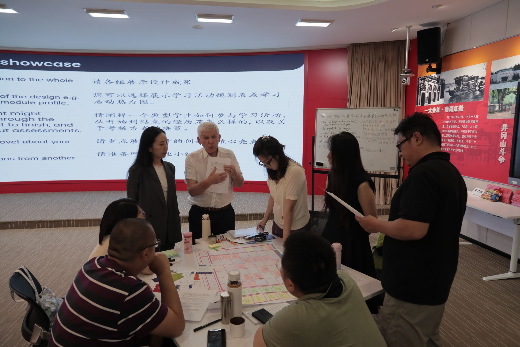 本次工作坊邀请英国开放大学资深教学专家Rhona Sharpe和Shaun Harley,采用“理论阐释+实操指导”模式,以全线下、面对面的授课方式展开,围绕学生画像构建、学习活动规划表设计、可视化学习数据分析等一系列课程开发核心环节,详细解构学习设计核心范式,以及在课程建构中所使用学习设计的关键流程与方法。参训教师通力协作创建课程平台、规划课程活动,并在英国开放大学专家指导下破除思维定势,对课程架构反复推敲。同时,围绕“如何平衡在线课堂互动与学生自主学习”“人工智能对在线学习环境的革新”等议题展开深度碰撞,最终形成兼具国际视野与校本特色的课程设计方案。