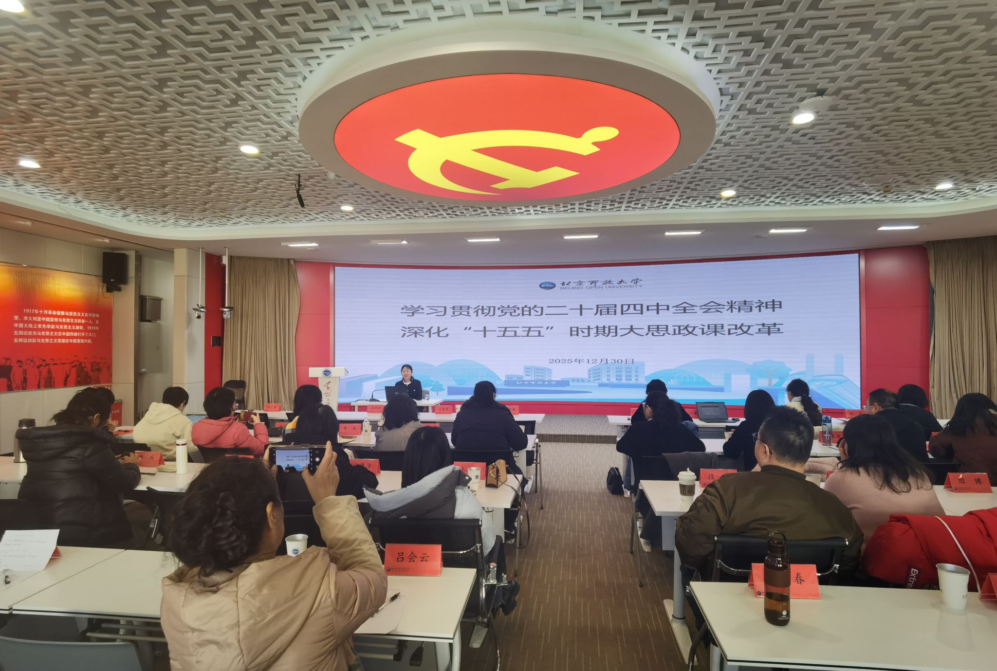 中国农业大学马克思主义学院院长张晖教授作了题为《学习贯彻党的二十届四中全会精神》的专题辅导讲座。她系统解读了党的二十届四中全会精神的核心要义与战略部署,立足“两个大局”的宏阔视野,结合首都思政课教师肩负的使命与责任进行深入阐释,引导教师准确把握当前形势与任务,自觉将会议精神有机融入思政课教学,切实提升理论阐释力与育人实效性。