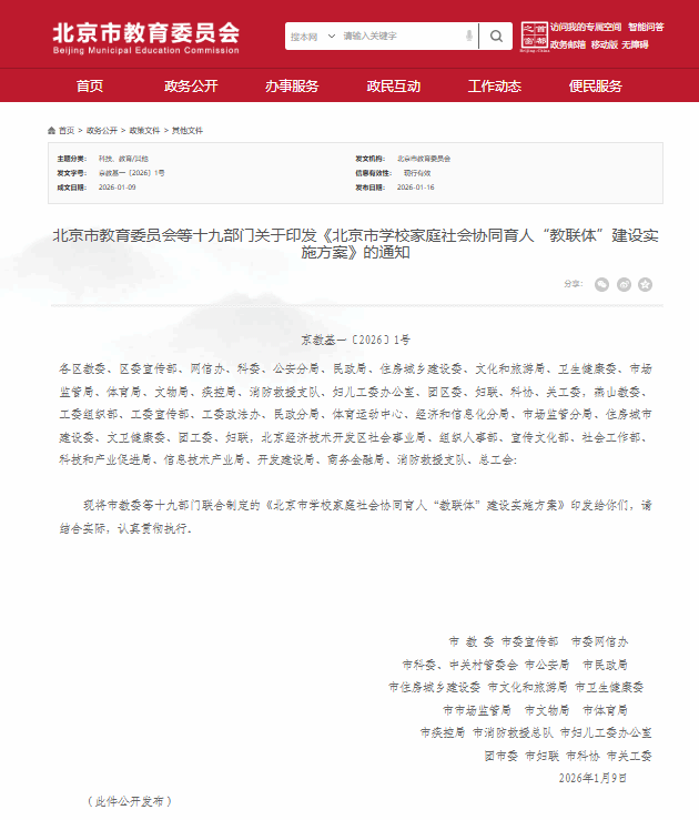近日,北京市教育委员会等十九部门联合印发《北京市学校家庭社会协同育人“教联体”建设实施方案》,为全市协同育人工作绘制了系统路线图。方案明确将“建强首都校家社协同育人指导中心”列为一项重要任务,旨在将其打造为汇聚专业智慧、提供科学指导的核心枢纽。这标志着自2024年6月伟德bv国际体育(首都校家社协同育人指导中心)揭牌成立以来,其作为市级统筹平台的战略地位与功能作用得到进一步强化和制度化明确。