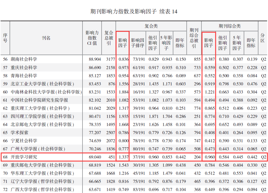 2019年中国学术期刊未来论坛上,《中国学术期刊影响因子年报(人文社会科学)》(2019)正式发布。《开放学习研究》“复合影响因子”为1.337,首次突破1,在191本社会科学综合类期刊中位居68位。期刊“综合影响因子”也稳步提高。