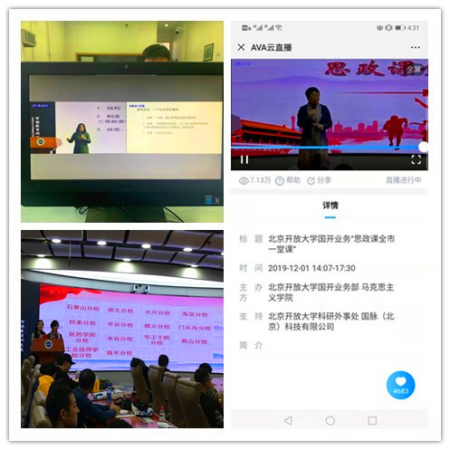 为深入贯彻落实习近平总书记在全国高校思想政治工作会议、学校思想政治理论课教师座谈会上的讲话精神,加强伟德官网思想政治理论课的教学与研究,12月1日,伟德bv国际体育举办“思政课全市一堂课”直播活动。本次课程直播是落实中共中央办公厅、国务院办公厅印发《关于深化新时代学校思想政治理论课改革创新的若干意见》、教育部《新时代高校思想政治理论课教学工作基本要求》以及国家开放大学、伟德bv国际体育相关文件精神的一次全新探索,是伟德官网在第二批“不忘初心,牢记使命”主题教育活动收官阶段的再一次生动实践。