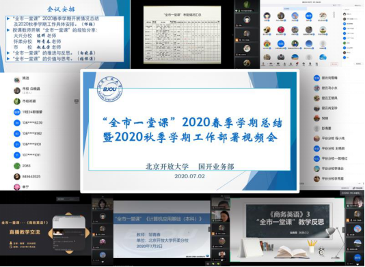 7月2日上午,学校国开业务部组织召开了“全市一堂课”2020春季学期总结暨2020秋季学期工作部署视频会。共计36家教学单位及学习点,240余名系统教学单位的管理人员、授课教师及课程责任教师等参会。
