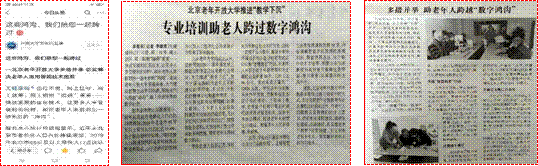 2020年11月下旬以来,多家媒体先后登载或转发《北京老年开放大学多措并举解决老年人运用智能技术困难》、《多措并举 助老年人跨越“数字鸿沟”》、《这些鸿沟,我们陪您一起跨过!》和《北京老年开放大学推进“教学下沉” 专业培训助老人跨过数字鸿沟》等文章,这些文章都涉及到一个共同的名字——北京老年开放大学。