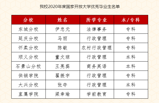 近日,伟德官网伊忠元等8名同学被国家开放大学授予“2020年度国家开放大学优秀毕业生”光荣称号。国家开放大学全国办学体系共592名同学获此殊荣。