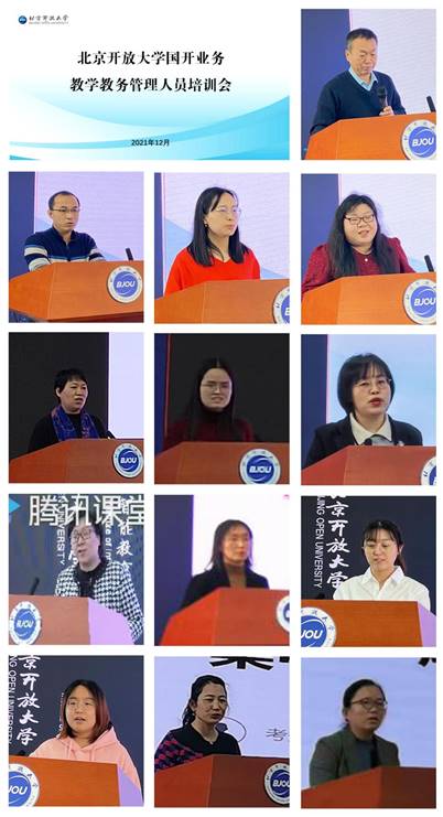 在培训第一模块,招生拓展部对招生计划、招生宣传、入学资格审核等环节进行了培训;培训第二模块由学籍科对学生信息修改、学籍异动、学籍学历复核、课程注册、毕业审核和学位审核等进行培训;第三模块由教学教务管理中心对专业课程管理及免修免考管理、直播教学和全市一堂课、形成性考核、实践环节、学习网等内容进行培训;第四模块由考务科对成绩管理、报考工作、纸考组考等进行培训。每个模块培训后都安排了工作研讨与交流环节,并对2021 年工作做了总结,部署了2022 年春季工作。