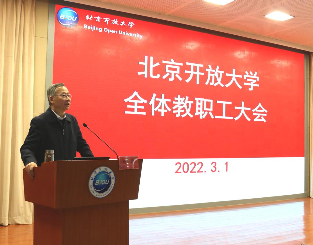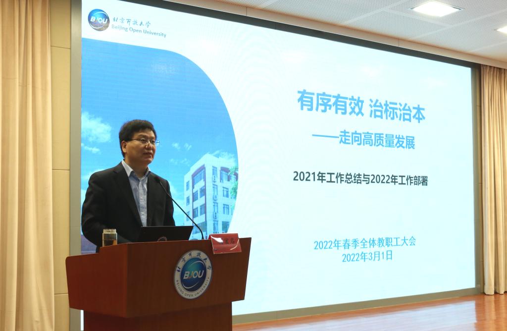 党委书记杨公鼎在讲话中指出,2021年学校充分发挥党建引领作用,发扬“北开精神”,持续攻坚克难,锐意改革创新,各项事业发展呈现了新的气象。杨公鼎以“聚焦质量提升年,推进学校高质量发展”为主题对全年工作提出三点要求。一要认清形势,坚定信心,增强推进高质量发展的使命感和责任感。要充分认识质量提升是贯彻新发展理念的必然要求,是迎接党的二十大胜利召开的实际行动,是实现一流开放大学建设目标的内在要求,是以评估为契机推动学校提质增效的迫切需要;二要明确任务,把握重点,打造推进高质量发展的工作亮点。力争实现党建工作水平、学历教育质量、非学历教育规模效益、信息化支撑能力、教师队伍素质、内部治理水平新的提升;三要凝聚共识,开拓奋进,全力推进各项工作任务落到实处。要坚持党建引领,以高质量党建推动学校事业高质量发展;要加强文化建设,以优良校风提振高质量发展的精气神;要狠抓工作落实,持续攻坚克难开拓学校高质量发展新局面;要坚持团结奋进,推动改革任务保持学校高质量发展好势头。
