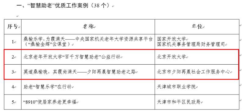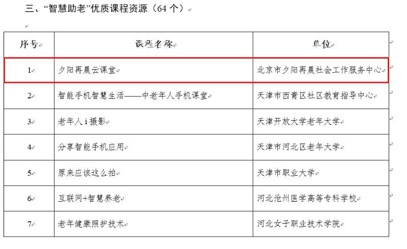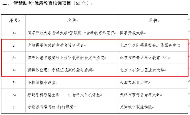 根据《教育部办公厅关于广泛开展老年人运用智能技术教育培训的通知》要求,在全国各省级教育行政部门推荐的基础上,经专家综合评议,全国共评选出38个优质工作案例、65个教育培训项目及64门课程资源。北京老年开放大学积极发挥市级老年教育统筹指导职能,协助市教委承担了北京市“智慧助老”优质工作案例、教育培训项目及课程资源项目推介工作。其中,由伟德官网报送的《北京老年开放大学“百千万智慧助老”公益行动》《莫道桑榆晚,其霞尚满天——夕阳再晨智慧助老之路》入选首批“智慧助老”优质工作案例;北京市密云区社区教育中心、北京市石景山区业余大学、夕阳再晨等单位的智慧助老教育培训项目入选优质教育培训项目,夕阳再晨云课堂入选“智慧助老”优质课程资源。