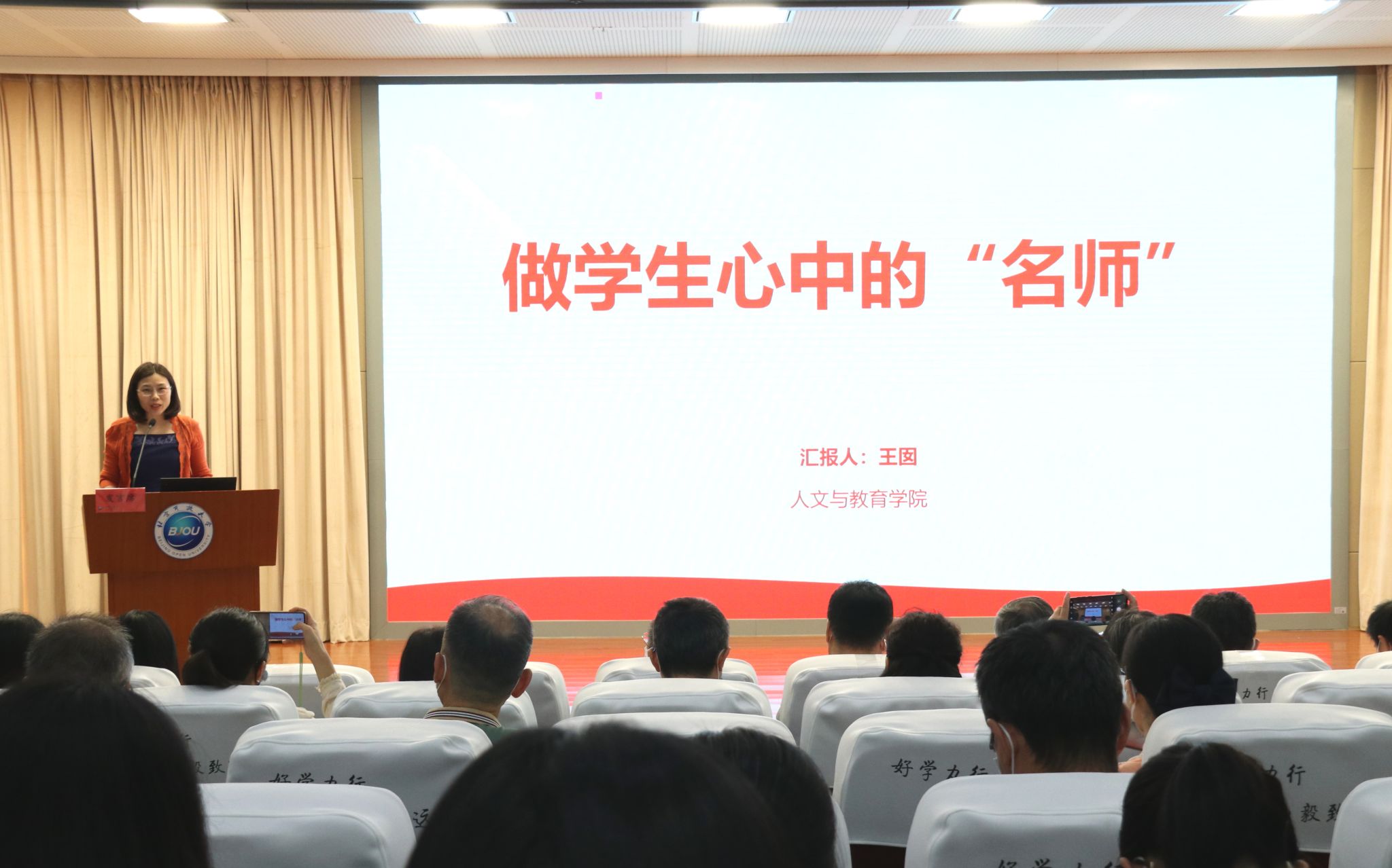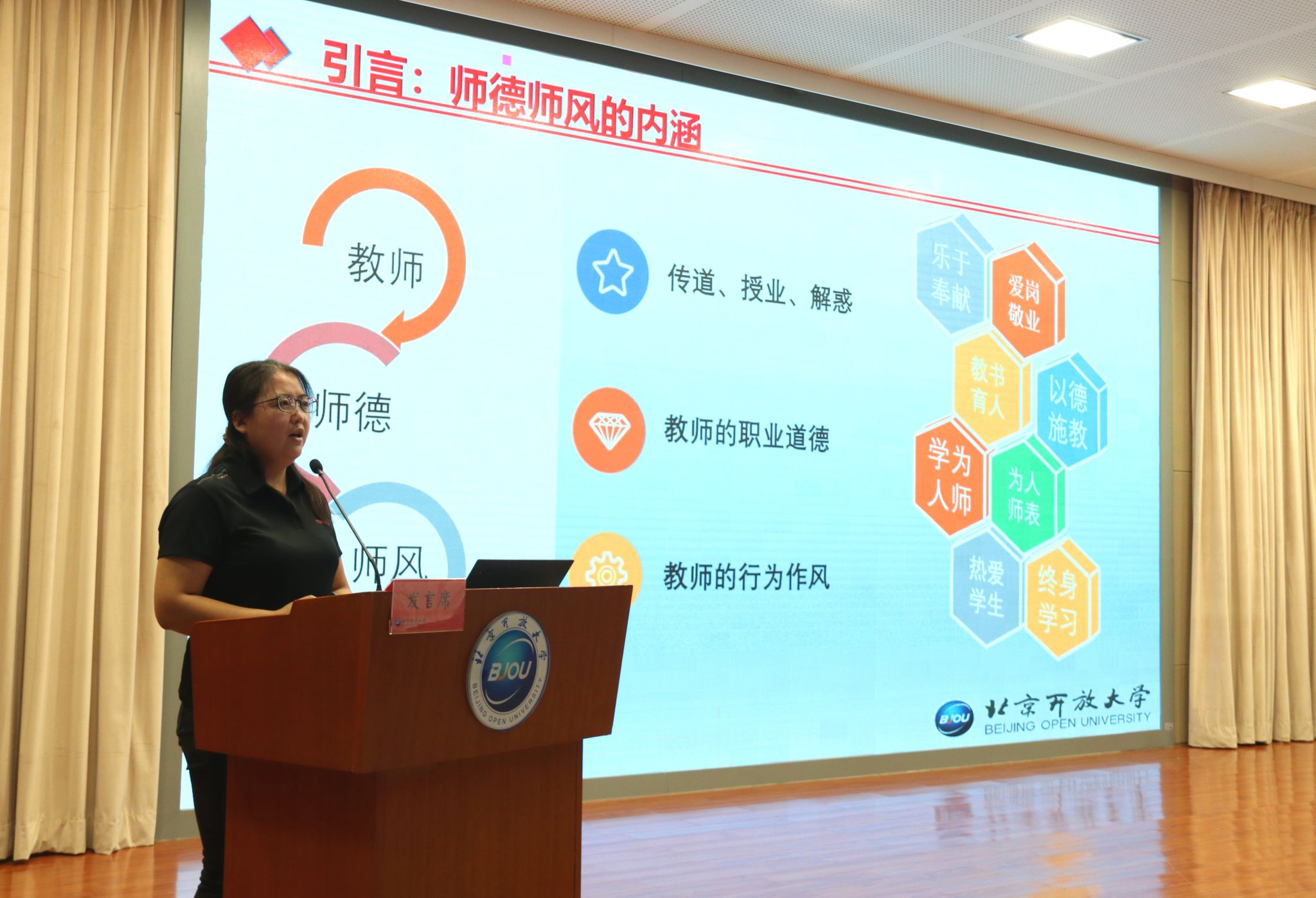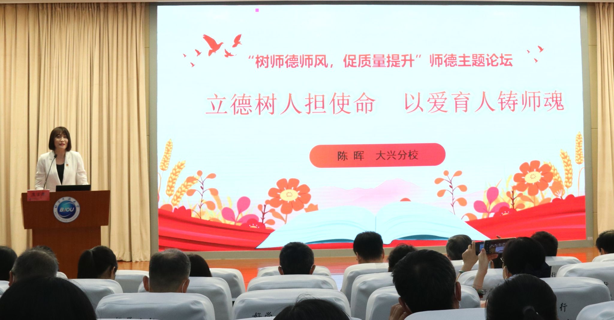 大兴分校教师陈晖以《立德树人担使命,以爱育人铸师魂》为题,从“扎根教学一线,深耕教改融合创新”、“倾听学生心声,保持党员的先进性”和“讲好中国故事,助力社区教育发展”三个方面,讲述了自己对于立德树人、为师之道的理解。虽然都是教学工作中的平凡事迹和日常点滴,却让我们的心灵受到了强烈深刻的震撼,为我们上了一堂有营养、有深度的师德教育课。