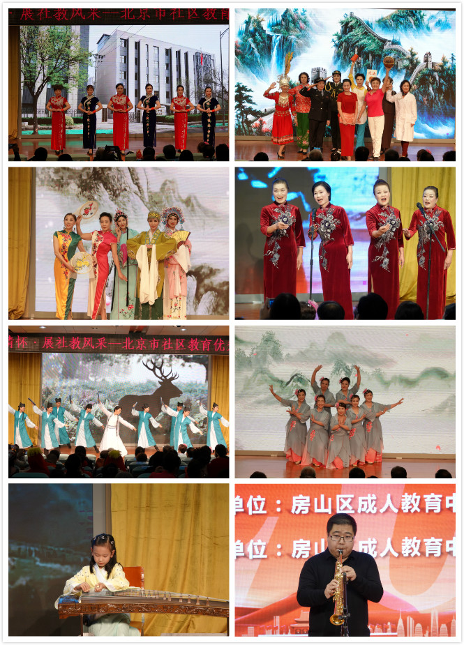 经过各区初选和全市遴选,共有21个节目参加了展演,表演形式包括歌曲、舞蹈、模特、乐器、话剧、朗诵、音乐剧等,涵盖了老、中、青、少各年龄段,年龄最大的85岁,最小的8岁。西城社区学院选送的《国粹》节目,演员以端庄的气质、多彩的服饰及丰富的肢体语言演绎了“国粹”精华。北京春藤社会工作促进中心选送的《迎国庆体育人展风采》节目,参与人员包括排篮足手球名将、田径体操名宿、亚洲标枪记录第一人和击剑银牌国家队领队,虽是满头白发,风采不减当年,充分展现了社区老年教育教学成果。密云区社区教育中心选送的《五彩课堂》节目,再现了社区教育中书法绘画、太极瑜伽、钢琴声乐、舞蹈模特、摄影电脑、数独英语等真实场景。东城区职工大学选送的《你的房本我的房》节目,把课堂搬到了展演舞台,以短剧小品形式开展普法宣传。房山区成人教育中心选送的巴乌合奏《赶摆归来时》,用巴乌吹奏心中的情歌,歌颂美好幸福生活的欢乐场景。其他各区选送的节目也内容丰富、赏心悦目、精彩纷呈,充分展现了社区教育优秀成果。