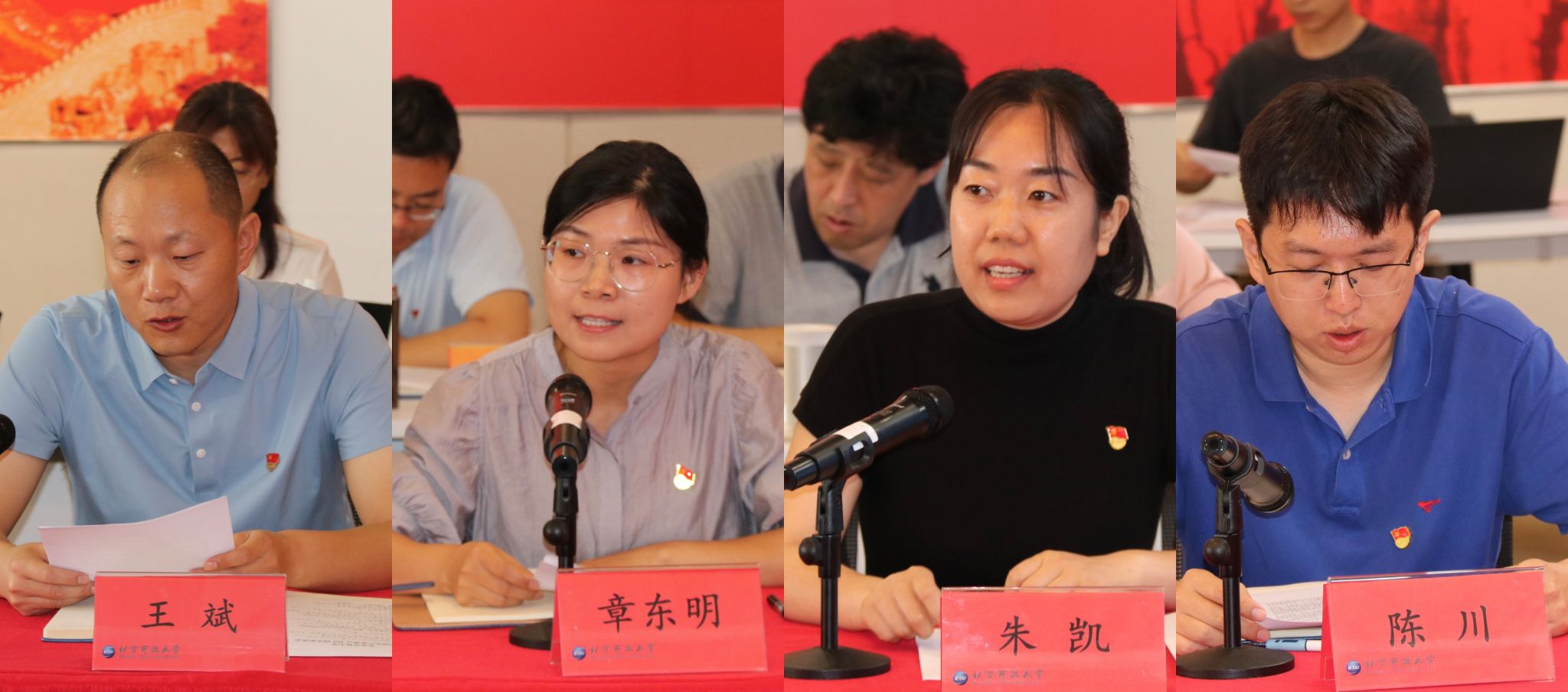 老年教育学院党支部书记殷丙山、人文与教育学院党支部书记潘中喜、城市管理学院党支部书记陈岩分别就党建研究、“标杆院系”“样板支部”培育创建引领事业发展,进行交流发言。