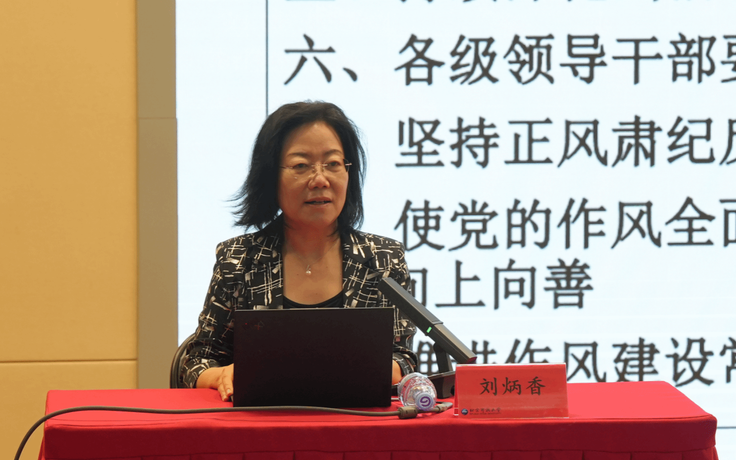 报告会上,刘炳香教授以“学习习近平总书记关于加强党的作风建设的重要论述”为主题,从“加强党的作风建设,凝聚民心、汇聚力量”“密切党群关系,巩固党的执政基础”“深入贯彻中央八项规定精神”“正风肃纪反腐贯通,推进作风建设常态化长效化”四个方面,系统阐述了习近平总书记关于加强党的作风建设重要论述的重大意义、科学内涵和实践要求。她通过翔实的数据和典型案例,深入分析了中央八项规定实施以来取得的显著成效,并针对当前党员干部作风建设中存在的突出问题提出了建设性意见。整场报告主题鲜明、内涵丰富,兼具理论高度和实践指导意义,为党员干部准确把握学习教育的精神实质和实践要求提供了有力指导。