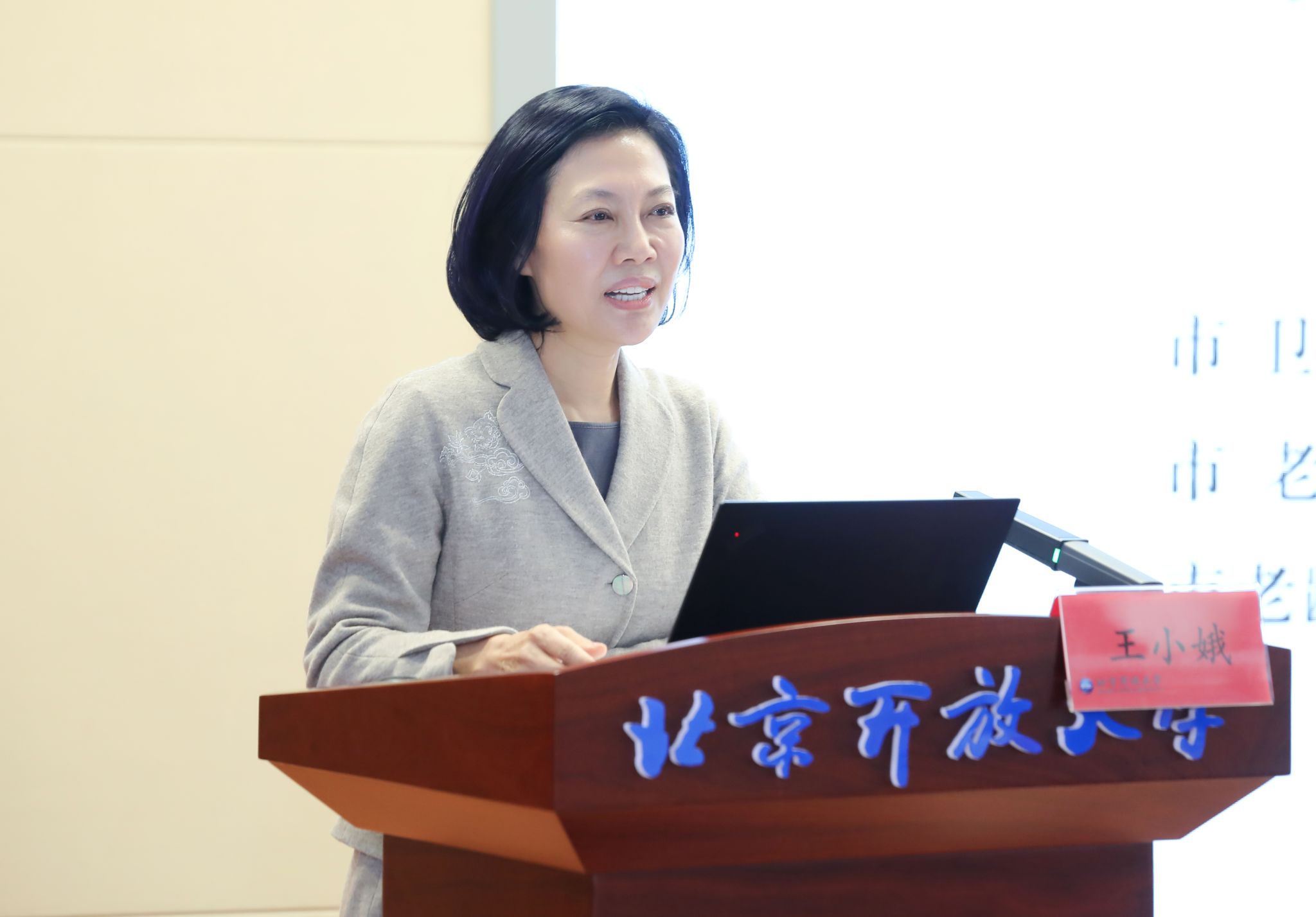 主旨发言环节,北京市卫生健康委党委委员,市老龄办常务副主任,市老龄协会会长,一级巡视员王小娥做了题为“践行积极老龄观,推动北京老年教育高质量发展”的主旨发言,系统讲解了北京市老龄化的现状和趋势,以百岁老人、银发达人等生动实例讲解了积极老龄观、健康老龄化的理念,以及老龄部门在跨越数字鸿沟,推动互联网+老年教育方面的努力,提出推进学校与社会课堂融合发展等具体举措。